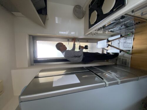 今回の所は折れた先に柱型が有り、一部だけ冷蔵庫の前に出てくる状態でしたので問題無いと了解を得て、折れ戸を設置させて頂きました。